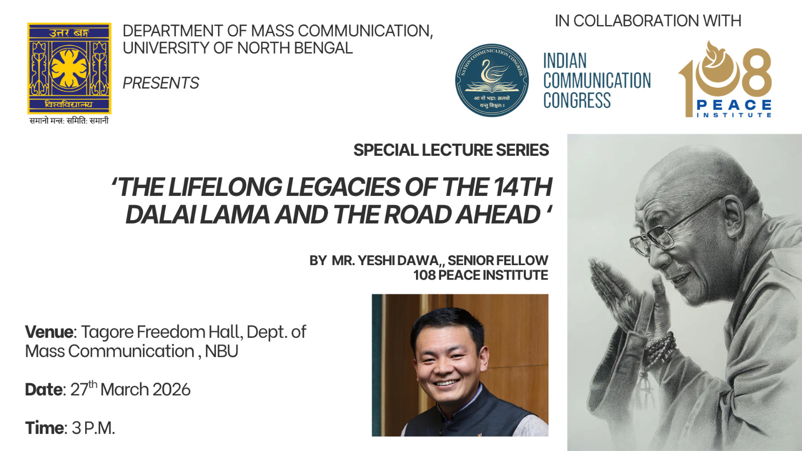March 27, Siliguri: The 108 Peace Institute, in collaboration with the Department of Mass Communication at North Bengal University, organised a talk titled “The Lifelong Legacies of the Dalai Lama and the Road Ahead,” delivered by Mr. Yeshi Dawa, a senior researcher at the 108 Peace Institute. The talk was attended by more than 20 students and faculty members.